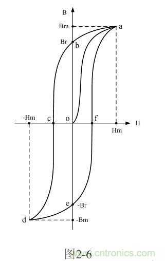 圖2-6是雙激式開關(guān)變壓器鐵芯磁感應(yīng)強(qiáng)度B與磁場強(qiáng)度H之間的關(guān)系曲線圖,或稱變壓器鐵芯磁化曲線圖或磁滯回線圖。之所以把圖2-6磁滯回線圖,是因為磁感應(yīng)強(qiáng)度B比磁場強(qiáng)度H滯后一個相位或者一段時間。