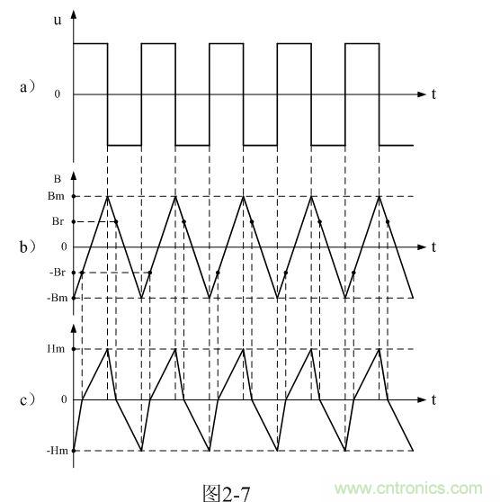 從圖2-7-a)和圖2-7-b)可以看出,每輸入一個交流脈沖電壓,變壓器鐵芯中的磁感應(yīng)強(qiáng)度B或磁通就要線性增長和下降一次,磁感應(yīng)強(qiáng)度變化的范圍是從負(fù)的最大值-Bm到正的最大值Bm,并且增長和下降的速率基本一樣。