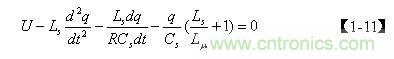 圖4中,當(dāng)電源開關(guān)管Q1導(dǎo)通時,設(shè)輸入電壓為U,流過Ls的電流為 i,流過Cs的電流為i1 ,流過Lu 的電流為i2 ,流過R的電流為i3 ,Cs存儲的電荷為q,如果忽略Lds的作用,則列出回路方程為: