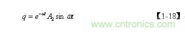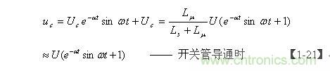 【1-21】式是當(dāng)電源開關(guān)管Q1導(dǎo)通時,分布電容Cs兩端電壓隨時間變化的表達(dá)式,它由兩部分電壓組成,一部分是電容Cs兩端電壓的半波平均值Uc ,由【1-19】式表示;另一部分是正弦阻尼振蕩,其最大振幅等于 Uc, e-at是一個小于1的衰減系數(shù)。