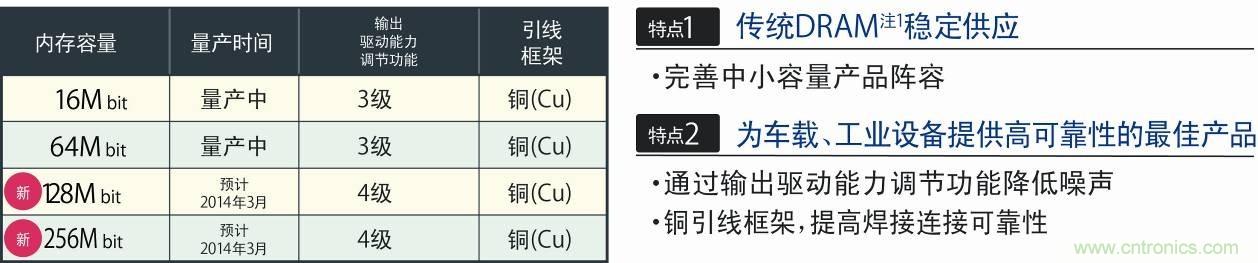 另外,DRAM的主流產(chǎn)品逐漸向大容量、高速化的DDR2/DDR3-SDRAM發(fā)展,中小容量SDRAM的供應(yīng)越來越不穩(wěn)定。LAPIS Semiconductor將中小容量的SDRAM定位為傳統(tǒng)DRAM注1,作為唯一可長(zhǎng)期供貨的日本國(guó)內(nèi)制造商,不僅面向車載用途市場(chǎng),而且面向更廣闊的工業(yè)設(shè)備市場(chǎng),正在不斷完善產(chǎn)品的產(chǎn)品陣容。