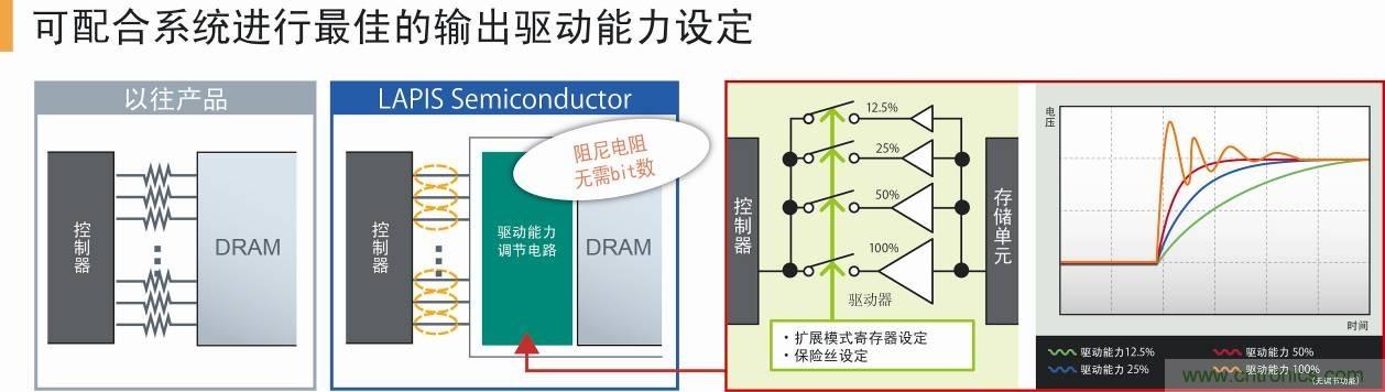 本功能有助于實(shí)現(xiàn)適合用戶系統(tǒng)的電流驅(qū)動(dòng)能力優(yōu)化、降低輻射噪聲、減少輻射噪聲對(duì)策零部件數(shù)量。另外,可按出貨時(shí)固定規(guī)格的驅(qū)動(dòng)能力設(shè)定供貨,即使使用已有的SDRAM控制器無(wú)需配置擴(kuò)展模式寄存器,即可使用最佳的輸出驅(qū)動(dòng)能力設(shè)定的產(chǎn)品。