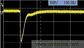 這是任何電源都存在的正?,F(xiàn)象。當(dāng)負載吸收電流發(fā)生跳變的瞬間,就會造成電源輸出端的電壓瞬間偏離設(shè)定值。這個示波器屏幕的截圖(圖1),就是當(dāng)我的一個電源的負載電流,從1mA 瞬間變化到500mA時, 輸出電壓經(jīng)歷了約30uS 瞬間變化。