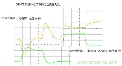 在加入電容后,對提升電路的瞬態(tài)響應(yīng)能力,往往會起到比較明顯的效果。如圖4所示的,我們在用一個通用電源測量GSM手機脈沖電流,在沒有并聯(lián)電容的時候,瞬間電源跌落會達到0.6V (見圖4左). 對于一個工作在3.8V的手機來說,這樣大的電源跌落足以造成手機自動關(guān)機。當(dāng)我們并聯(lián)了一個2000uF的電容后,電源跌落降到了0.2V以下,得到明顯改善,見圖4右所示(圖中,黃色曲線為電壓,綠色曲線為電流)。