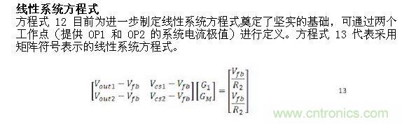 Vcs1 和 Vcs2 可通過方程式 4 確定。請(qǐng)選擇 R2 的值。最佳實(shí)踐是選擇已經(jīng)存在于電源設(shè)計(jì)中的值,因?yàn)檫@有助于確保網(wǎng)絡(luò)穩(wěn)定性。轉(zhuǎn)換器的反饋電壓 Vfb 可在穩(wěn)壓器產(chǎn)品說明書中找到。這樣我們可手動(dòng)或用數(shù)學(xué)工具解算線性系統(tǒng)方程式,結(jié)果就是 G1 和 GM 電導(dǎo)值。反過來,其結(jié)果就是 R1 和 RM。
