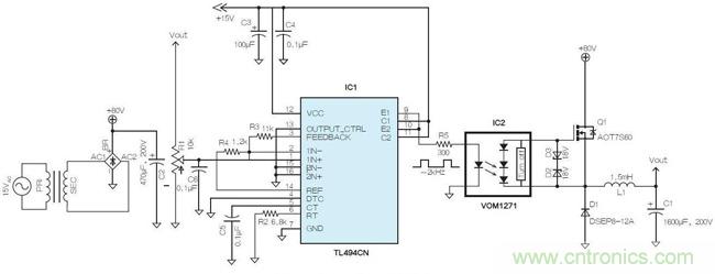 這里嘗試在開關穩(wěn)壓器中使用了光電耦合器(VOM1271),該耦合器具有一個內(nèi)置的快速關斷器件。如果將200pF柵極電容連接至IC2,則開關時間(ton與toff)分別為53μs和24μs。有鑒于此,降壓轉(zhuǎn)換器選擇了2kHz的開關頻率。此處選用了德州儀器(TI)的TL494(IC1)作為脈沖調(diào)制控制器。