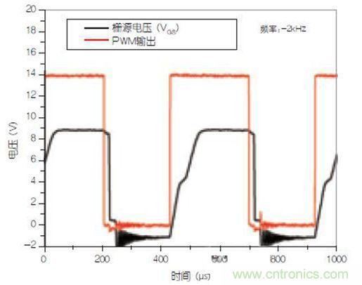 可以看到,盡管toff足夠快,但ton仍約為80μs。對于許多開關應用來說,這個開啟過程是較慢的。若將開關頻率設置為2kHz,應該不會導致太多開關損耗,對于PWM占空比較大的負載條件來說更是如此。