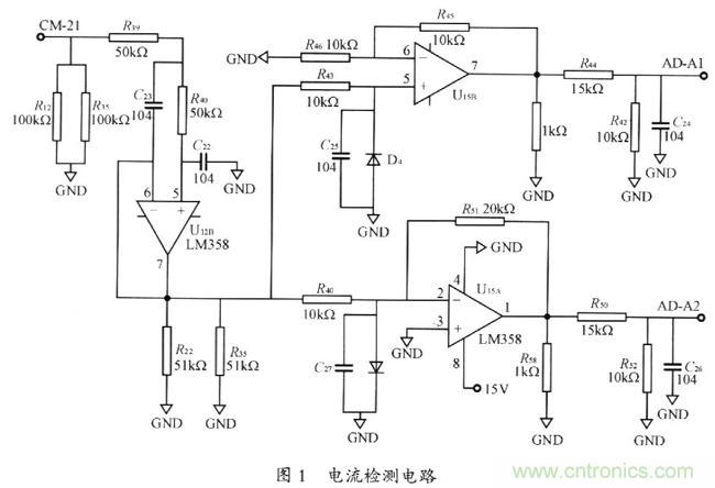 電池充放電電流的大小尤為關(guān)鍵。電路圖如圖1所示,因為是既檢測充電電流也檢測放電電流,故在小電阻上的電壓又是兩個方向,在電路檢測中用兩個通道分別檢測,這樣也便于分別進(jìn)行信號的調(diào)理,同時也便于用A/D轉(zhuǎn)換器的一個輸入通道來測量。