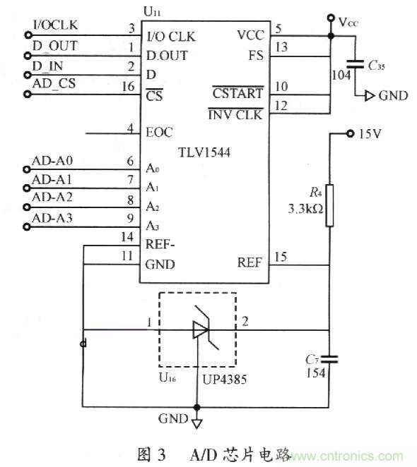 A/D轉(zhuǎn)換芯片采用TLV1544。TLVl544的主要特點是:寬范圍的單電源供電,VCC可為2.7~5.5V;芯片內(nèi)部有著較高的轉(zhuǎn)換速率,轉(zhuǎn)換時間小于10μs;芯片提供4路外部輸入通道,通過編程給芯片不同的狀態(tài)字設(shè)置可以任意選擇4個輸入通道之一;芯片有4個端口作為同步串行接口,通過SPI總線的形式與微處理器連接;11位A/D轉(zhuǎn)換,足以滿足系統(tǒng)的要求。如圖3所示。