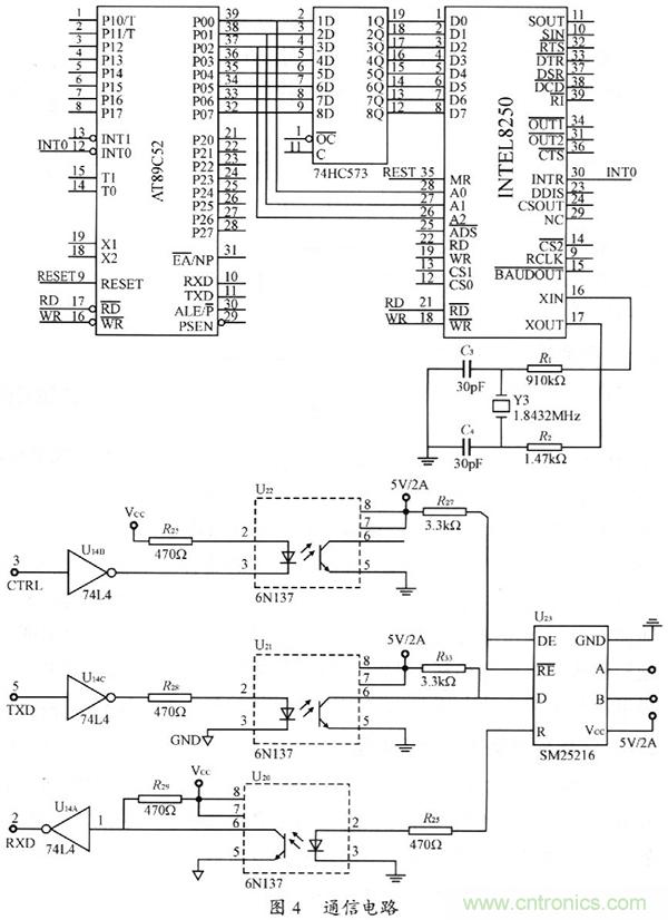 整個系統(tǒng)內(nèi)部通過RS485進(jìn)行通信。具體電路如圖4所示。因為控制芯片都采用AT89C52,作為主監(jiān)控單元CPU只有一個串口,而其并口也沒有充分利用起來,故通過可編程串行接口芯片8250擴(kuò)展串口,用并口來模擬串口。