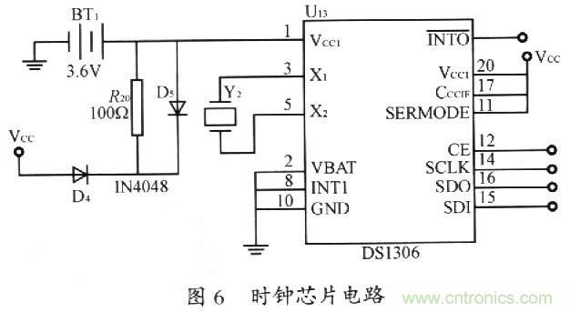 采用功能齊全的時鐘芯片DS1306。DS1306的時間、日歷和報警器可以通過寫相應(yīng)的寄存器位來設(shè)置和初始化。通過讀相應(yīng)寄存器就可獲得日歷和時間。DSl306的電源供給有三種運行方式,本系統(tǒng)采用可充電電池的方式,如圖6所示。