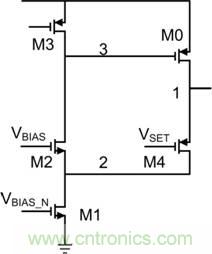 因此,輸出電壓對(duì)溫度和工藝變化極為敏感。要避免這種問(wèn)題,就必須創(chuàng)建一個(gè)更為理想的跟隨器,其中 M4 是反饋環(huán)路的一部分(圖3)。
