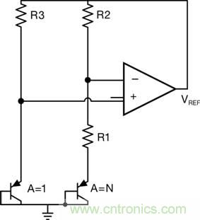 電阻器R2和R3分別可確定通過(guò)Q1和Q2 的電流值。R2和R3的變化可導(dǎo)致參考電壓(公式5)的正溫度系數(shù)不準(zhǔn)確。不過(guò),可通過(guò)對(duì)電阻器R2與R3進(jìn)行良好匹配來(lái)降低該變化所引起的誤差。