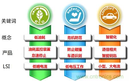 第二個(gè)關(guān)鍵詞是 "信息與舒適" (comfort)。除作為出行工具之外,汽車更多被視為日用品,其智能化也在不斷發(fā)展,例如可以下載并欣賞喜歡的音樂,在路上即可輕松獲得目的地的信息等。而為了實(shí)現(xiàn)這些功能,需要眾多通信相關(guān)的電子元器件。另外,與提高舒適性相關(guān)的電子化也在不斷發(fā)展,無(wú)需鑰匙即可開關(guān)車門和啟動(dòng)引擎的智能鑰匙在普通車輛中已基本普及等,使車內(nèi)越來(lái)越成為更舒適的空間。