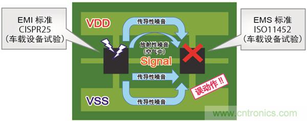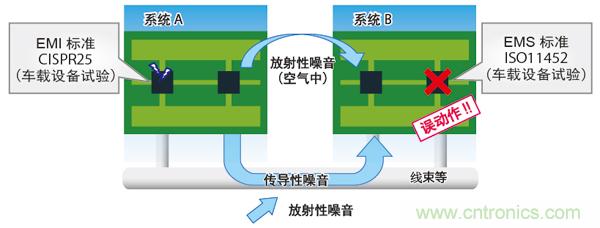 因此,對(duì)車載用產(chǎn)品來(lái)說(shuō),不妨礙其他設(shè)備(發(fā)射干擾)、以及受到其他設(shè)備妨礙時(shí)能保持本來(lái)的性能(抗干擾)是非常重要的。