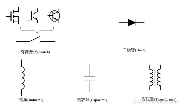 開關電源功率電路的五個基本元件:開關,二極管,電容,電感,變壓器