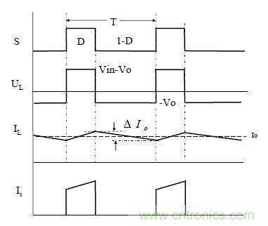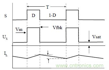 在這階段,電流波形是一條斜率為負的斜線,斜率為-Vout/Lo。當開關再次導通時,二極管迅速關斷,電流從輸入電源和開關管流過。在開關導通前瞬間,電感上的電流Imin就是開關管通過的初始電流。