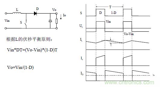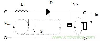 升壓變換器與BUCK變換器有著相同的組成部份,只是它們的位置被重新布置了一下。新的布局使變換器與正激式變換器的工作過程完全不同。在這種情況下,開關管導通時,電流環(huán)路僅在包括電感,開關管和輸入電壓源。在這段時間中,二極管是反向阻斷的。電感電流波形也是以固定斜率上升,可用下式描述: