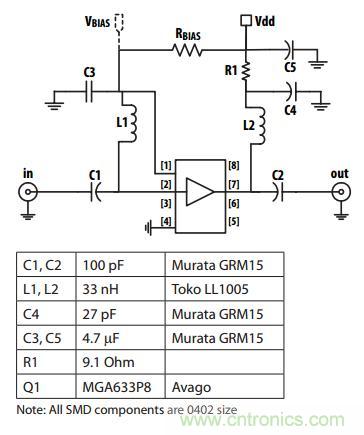 無論是晶體管的設(shè)計(jì) 還是偏壓調(diào)整器的工作,都在盡量避免使用額外的匹配網(wǎng)絡(luò)。主要是擔(dān)心會(huì)帶來插入損耗和噪聲系數(shù)的增加。晶體管的幾何結(jié)構(gòu)和它的標(biāo)準(zhǔn)電流已經(jīng)可以保證其輸入 阻抗在50歐姆附近。內(nèi)部集成的動(dòng)態(tài)偏壓調(diào)整器通過外加電阻的方式也可以保證其不影響低噪放的輸入阻抗。這些措施都是用來保證低噪放不需要外加的輸入匹 配,幫助獲得最小的噪聲系數(shù)。
