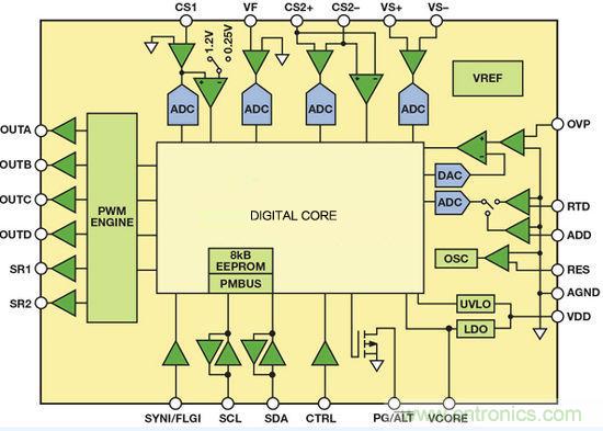 該器件非常適合高密度DC-DC電源轉換,具有6個可編程脈沖寬度調制(PWM)輸出,可控制大部分高效電源拓撲。另外,該器件還能控制同步整流(SR),并集成6個模數轉換器(ADC),能夠采樣模擬輸入電壓、輸入電流、輸出電壓、輸出電流、溫度以及其它參數。轉換為數據后,將這些信號發(fā)送至數字內核模塊進行處理。該器件采用靈活的狀態(tài)機架構,以硬件實現全部功能,提供穩(wěn)定可靠的解決方案,但無法通過編程實現設計以外的功能。器件的全部功能--包括輸出電壓調整--均以數字方式處理。為了調整輸出電壓,應通過PMBus接口發(fā)送一條命令,改變數字基準電壓值。