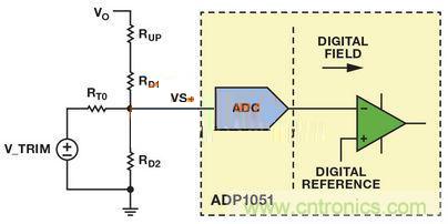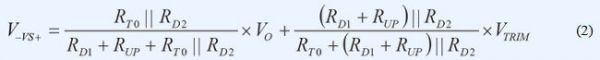 VS+引腳上的正常工作電壓為1V。若 VTRIM為1V左右且RT0遠大于RD2,則可忽略電路的其余分支部分。復合網絡用作簡單分壓器,并調節(jié)RUP電阻值,提供類似于模擬控制器的特性,實現了模擬電源模塊中的電壓向上調整。