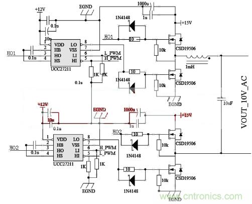 可以濾除載波頻率。考慮到MOS管需要相對較小的導(dǎo)通電阻RDS(on)和較小上升時間和下降時間的,本系統(tǒng)選用CSD19506。本系統(tǒng)需要驅(qū)動全橋,為了提高M(jìn)OSFET的導(dǎo)通速度,降低開關(guān)損耗,因而選用TI提供的高速半橋驅(qū)動芯片UCC27211。圖2是全橋部分電路圖。