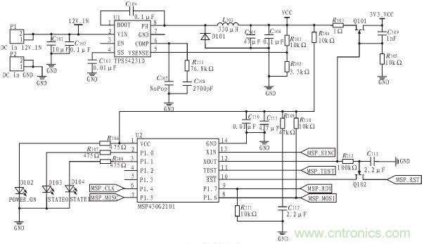 本文通過增加TI的MSP430低功耗MCU配合BQ500410A來實現(xiàn)系統(tǒng)的低功耗。為了實現(xiàn)低功耗,一種最直接的方法是無負(fù)載時直接關(guān)斷電源使BQ50041A 完全關(guān)機(jī)。但是這樣做的話,包括充電狀態(tài)、錯誤狀態(tài)、操作模式及驅(qū)動引腳狀態(tài)信息等將會完全丟失。增加MSP430 后,BQ500410A 可以周期性的關(guān)機(jī)來節(jié)節(jié)省功耗,其喚醒信號由MSP430 來提供。同時,各種狀態(tài)信息也由MSP430 來保存,LED 狀態(tài)指示燈也由原先的BQ500410A 驅(qū)動變?yōu)橛蒑SP430 來驅(qū)動。如此一來,雖然系統(tǒng)的復(fù)雜度及成本提高了, 但是待機(jī)功耗由原先的300 mW 降低到90 mW 左右。