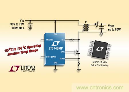 LT3748MP 的工作結(jié)溫范圍為 55°C 至 150°C,該器件采用 MSOP-16 封裝,并去掉了 4 個引腳以提供額外的高壓引腳間隔。