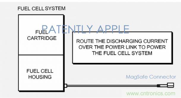 在這種專(zhuān)利一種可能的實(shí)施方案中,蘋(píng)果的燃料電池,可以作為一個(gè)獨(dú)立的供電模塊,通過(guò)MagSafe連接線纜和蘋(píng)果筆記本電腦連接。不過(guò)蘋(píng)果也表示,這種供電設(shè)備可以采用市面上的其他線纜,除了供電之外,線纜還可以作為電子設(shè)備和燃料電池之間的通信管道。