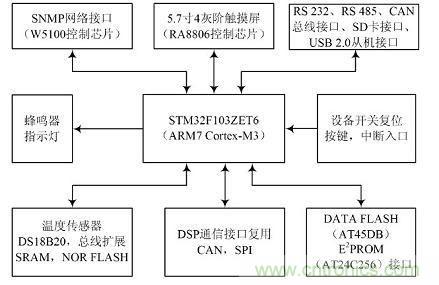 人機(jī)交互控制模塊是此IPS 設(shè)計(jì)中最為復(fù)雜的數(shù)字化管理模塊, 它不僅監(jiān)測(cè)和管理逆變系統(tǒng)的運(yùn)作, 還要保證IPS 控制器與外界的通信。設(shè)計(jì)中要求人機(jī)交互模塊能處理復(fù)雜的任務(wù)調(diào)度和很強(qiáng)的突發(fā)訪問(wèn)( 中斷) 處理, 這就必須有較高運(yùn)行速度;模塊內(nèi)部還要有豐富的擴(kuò)展接口提供IPS 與外部即時(shí)通信; 具備優(yōu)越的總線控制和訪問(wèn)機(jī)制等。綜合考慮上述需求, 設(shè)計(jì)中選擇了意法半導(dǎo)體( ST ) 公司推出的最新32 位單片機(jī)STM32F103ZET6 ( 以下簡(jiǎn)稱ST M32) 。ST M32 是基于ARM7 Co rtexM3 內(nèi)核架構(gòu)的高速高性能嵌入式控制芯片, 擁有72 MHz 內(nèi)核工作頻率和1. 25 DMIPS/ MHz的指令流水處理速度; 先進(jìn)的總線結(jié)構(gòu)和多達(dá)16 級(jí)的帶DMA 功能搶占中斷機(jī)制( NIVC) [ 10] 。如圖3 所示,設(shè)計(jì)中ST M32 通過(guò)SCI 接口及1 根中斷請(qǐng)求/ 接收線與DSP 2808 進(jìn)行通信; 利用片上擴(kuò)展的其中2 個(gè)SCI 口分別作為RS 232 和RS 485通信協(xié)議口; CAN 總線接口和U SB 總線通過(guò)共享數(shù)據(jù)緩沖區(qū)和中斷向量入口與外界互聯(lián)通信;通過(guò)STM32 的26 位地址總線和16 數(shù)據(jù)總線擴(kuò)展外掛256 KB SRAM 和4 MB N OR FLASH, 以及8 位數(shù)據(jù)口的LCM 模塊RA8806 以及用于SNMP 的16 位并行數(shù)據(jù)的以太網(wǎng)芯片W5100; 啟用ST M32 的SDIO 總線以啟用用戶插入SD 卡存儲(chǔ)查詢IPS 狀態(tài)數(shù)據(jù)功能; 啟用現(xiàn)場(chǎng)環(huán)境下獨(dú)立時(shí)鐘看門狗電路和STM32 特有的窗口看門狗;啟用內(nèi)部芯片溫度傳感器采樣監(jiān)控, RC時(shí)鐘源以及外部喚醒功能; 通過(guò)通用引腳接入DS18B20 溫度傳感器對(duì)環(huán)境溫度的采樣, 預(yù)留I2 C 方式E2PROM 和SPI 方式的DA TA FLASH 接口為產(chǎn)品后續(xù)升級(jí)開(kāi)發(fā)做準(zhǔn)備。
