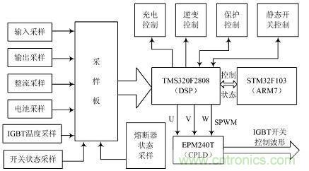 該模塊是逆變信號(hào)產(chǎn)生及反饋檢測(cè)調(diào)整模塊, 核心是一片C2000 系列高性能DSP 處理器TMS320F2808(以下簡(jiǎn)稱F2808) , F2808 產(chǎn)生的SPWM 信號(hào)經(jīng)過(guò)CPLD 進(jìn)行邏輯延時(shí)移相形成三相逆變器IGBT 控制信號(hào)。F2808 是德州儀器( TI) 公司的一款高速DSP 芯片, 最高運(yùn)行速度可達(dá)100 MIPS, 為適應(yīng)工控強(qiáng)干擾環(huán)境, F2808 內(nèi)部集成了增強(qiáng)型輸入捕獲單元( eCAP) 和帶死區(qū)控制功能的輸出比較PWM 產(chǎn)生單元( ePWM) ,12 位16 通道快速ADC 單元; 內(nèi)核支持用于定點(diǎn)DSP實(shí)現(xiàn)浮點(diǎn)運(yùn)算的IQ 變換函數(shù)庫(kù); 還有諸如SCI, SPI,eCAN 等豐富而通用的外設(shè)接口。如圖2 所示, 設(shè)計(jì)中F2808 的主要任務(wù)是監(jiān)控IPS 功率部分的開(kāi)關(guān)狀態(tài)和動(dòng)作, 根據(jù)逆變器和負(fù)載狀態(tài)反饋調(diào)整3 路SPWM波形的輸出,電池充電脈沖控制。DSP 輸出的3 路SPWM 信號(hào)直接送給CPLD,經(jīng)過(guò)CPLD 的等間隔脈沖延遲移相作為逆變器產(chǎn)生U, V, W 三相電的控制波形。
