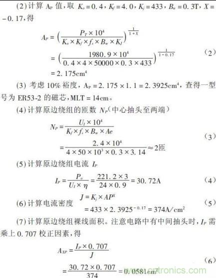 采用面積乘積(AP)法進(jìn)行設(shè)計(jì)。對(duì)于推挽逆變工作開關(guān)電源,原邊供電電壓UI=24V,副邊為全橋整流電路,期望輸出電壓UO=220V,輸出電流IO=3A,開關(guān)頻率fs=25kHz,初定變壓器效率η=0.9,工作磁通密度Bw=0.3T.