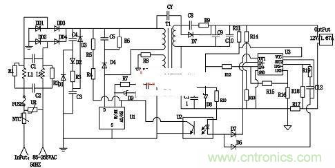 電源的核心部分采用反激式變換器,結(jié)構(gòu)簡(jiǎn)單,易于實(shí)現(xiàn)。整體設(shè)計(jì)電路圖如圖1.