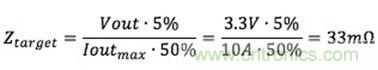 拿12V輸入、3.3V/10A輸出VRM要求作為例子,目標阻抗的計算公式是: