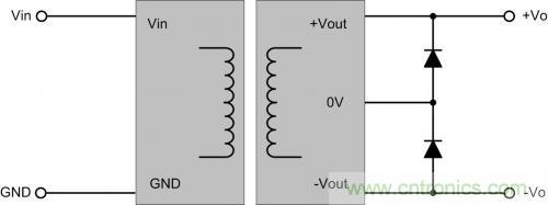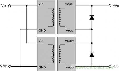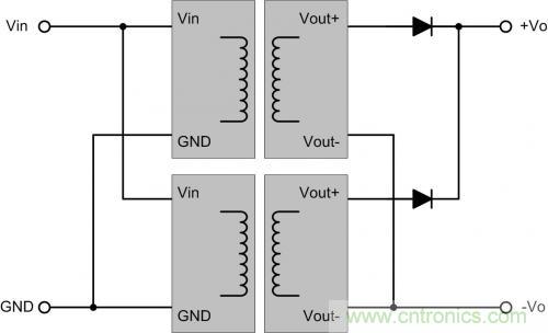 如一個(gè)5V轉(zhuǎn)±12V的電源,若臨時(shí)需要5V轉(zhuǎn)24V,可把負(fù)當(dāng)?shù)兀敵霎?dāng)24V電源,輸出24VDC。應(yīng)用時(shí),在輸出各方向并聯(lián)一個(gè)二極管續(xù)流,防止兩路啟動(dòng)時(shí)間不同,由一路通過負(fù)載給另一路的內(nèi)部電路充電。