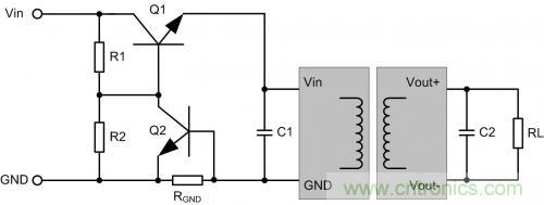 通過檢測(cè)RGND的電流,增大Q2的導(dǎo)通電壓后,把Q1關(guān)斷,停止供電,達(dá)到過流或短路保護(hù)的目的。