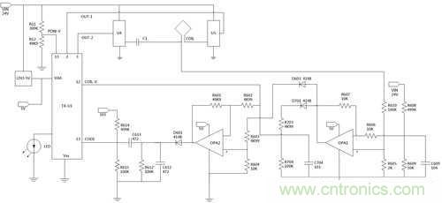 在圖4中由兩個運算放大器OPA1、OPA2構成兩個差動放大電路,其OPA1動作為由R608與R609進行分壓驅動電源作為差動參考點;另外,由R610與R605對線圈諧振訊號進行分壓作為放大訊號輸入,在此有一配置為R608、R609與R610、R605之分壓比例皆為50比1,其用意在于取出與電源驅動電壓與諧振訊號中開關電壓失真相等后,透過差動放大出諧振訊號高于電源驅動電之成分進行放大。