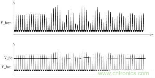 另外一路由D603透過分壓電阻R603、R604后輸入到OPA2作為差動放大輸入端,其訊號為圖5中之V_hw訊號再經OPA2放大后輸出為V_hwa訊號,D603、D701用來控制V_dc與V_hw有相同的壓降,而R603、R604、R703、R704用來設定分壓比例使得V_dc能保持在略低于V_hw之訊號,確保OPA2可以只放大波峰中高低變化之部分。