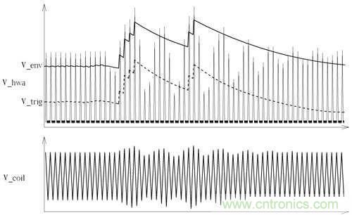 OPA2輸出訊號再傳送到D601、R612、C612為一檢波電路,參考圖6中經過D601訊號為V_env該訊號為波峰訊號之檢波結果,但該訊號之直流穩(wěn)態(tài)非固定值,所以在透過C613、R614、R615構成之去交連耦合電路得到之波形為V_trig,而該波型最后傳到TX-U1進行解碼處理,在圖6中能看到原供電線圈上之訊號V_coil轉換到V_trig之差異。