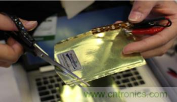 用剪刀減掉電池一角后,仍然能夠安全、正常工作的柔性全固態(tài)電池