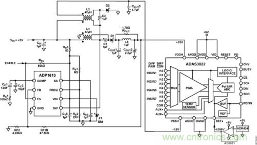 ADP1613用作單端初級原邊電感(SEPIC) Cuk轉(zhuǎn)換器,是ADAS3022在外部5 V電源供電情況下,為其提供20 mA時所需±15 V高壓電源以及最大值為3 mV的低輸出紋波的理想選擇。本應用中,ADP1613的開關頻率為1.3MHz。如圖3所示,ADP1613盡可能地減少了外部元器件數(shù)目,并且具有超過86%的效率,因此它能滿足ADAS3022的規(guī)格要求。在該拓撲中使用低成本ADP1613的最大優(yōu)勢,是它在兩條供電軌之間的出色跟蹤能力,同時使用現(xiàn)成的耦合電感可產(chǎn)生±15 V電壓。除此之外,還能通過ADIsimPower設計工具輕松快捷地完成設計制造。