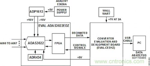 測試設置的功能框圖如圖4所示。ADP1613評估板由外部+5 V電源驅(qū)動,產(chǎn)生ADAS3022板所需的±15 V電壓。7 V直流壁式電源為EVAL-CED1Z板供電。EVAL-CED1Z板上的穩(wěn)壓器提供ADAS3022板所需的5 V電源。運行交流測試時,采用Audio Precision SYS-2702產(chǎn)生低失真輸入信號。