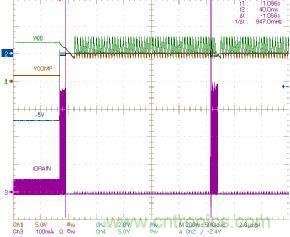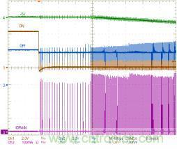 再按下開關(guān)時,ON引腳被強制連至SGND引腳,且連接時間大于DEB_ON,芯片退出零功耗模式。芯片通過軟啟動恢復(fù)開關(guān)操作,重新開始輸出功率。在實際應(yīng)用中,ON和OFF引腳可以由微控制器控制,如圖3所示。實際上,這些引腳的上拉電阻有幾微安的驅(qū)動能力,可在零功耗模式供給微控制器。