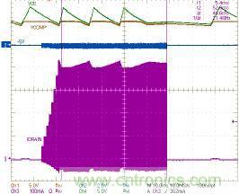 新的脈沖跨周調(diào)制模式保護功能可避免漏極電流過高和變壓器飽和,這兩種現(xiàn)象在轉(zhuǎn)換器啟動階段特別常見(圖5中的虛線),因為當輸入和輸出電壓差值很大時,電壓時間開始失衡,如果不加以控制,IDRAIN將會迅速升高。