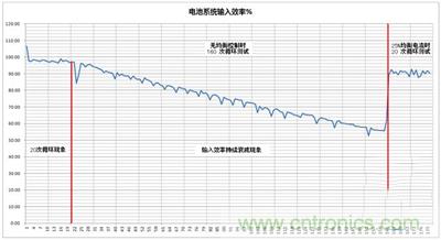 圖1中,關(guān)閉主動(dòng)均衡控制的160次循環(huán)測試中,前20次的輸入效率保持在95%以上,一個(gè)非常平穩(wěn)的輸入效率,這就是“首20次循環(huán)現(xiàn)象”;在20次以后的測試中,電池系統(tǒng)的輸入效率隨充放電次數(shù)下降(充電和放電條件不變),在第40次時(shí),約為90%,在第70次時(shí),約為80%,在100次時(shí),已經(jīng)降到70%,而在第160次時(shí),約為55%。