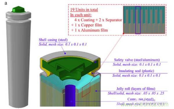 18650電池主要由三部分組成:安全閥、卷芯和低碳鋼外殼。安全閥通常由正溫度系數(shù)材料、鋁安全閥和不銹鋼正極端子、氣體密封墊等組成,電芯由正極、負(fù)極和隔膜組成,在本試驗中正極的活性物質(zhì)的成分為LiCoO2。軸向載荷的加載速度為5mm/min,所有的試驗電池在試驗之前都已經(jīng)完全放電(SOC=0)。測試結(jié)果顯示,18650電池在軸向壓力測試中壓力呈現(xiàn)出緩慢上升——快速上升——輕微下降——快速上升的趨勢,而電壓測試顯示,18650電池在變形達到4mm的情況下才會發(fā)生失效,而且通過試驗發(fā)現(xiàn),18650電池的電壓突降主要是由于電池內(nèi)部短路造成的,而不是內(nèi)部結(jié)構(gòu)的斷路。為了研究18650在軸向壓力下失效的機理,Juner Zhu還利用有限元軟件對其進行了分析,模型中的材料主要采用了彈塑性模型,并且考慮了各種材料的各向異性的特點,模型中包涵了上百萬的計算單元,軸向載荷的加載速度被設(shè)置為1m/s。