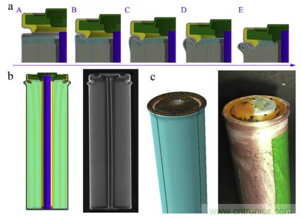 美國麻省理工學(xué)院的Juner Zhu等人利用18650電池研究了在發(fā)生軸向擠壓的過程中鋰離子電池的發(fā)生熱失控的機理,并利用有限元分析模型進行了仿真分析,該模型還原了不同的軸向壓力對鋰離子電池造成的影響,分析結(jié)果得到了CT掃描的驗證,該仿真分析結(jié)果發(fā)現(xiàn)了兩種可以解釋在擠壓試驗中導(dǎo)致鋰離子電池發(fā)生短路原因。