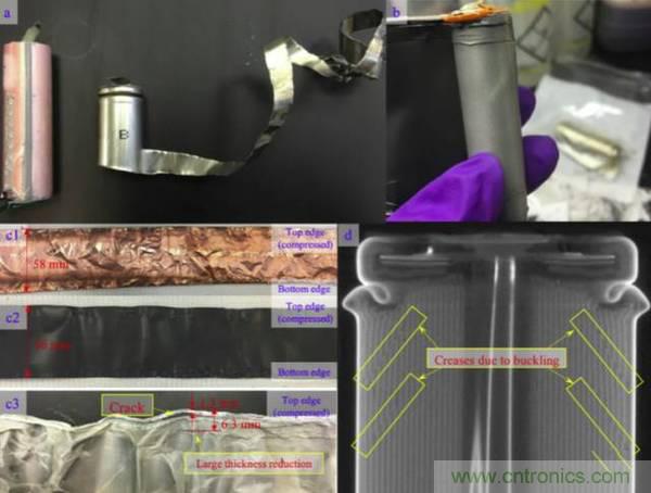 對試驗后的18650電池進行拆解顯示,雖然電芯發(fā)生了嚴(yán)重的變形,但是正負(fù)極并沒有發(fā)生斷裂,反而是隔膜在距離上部邊緣1.3mm的位置出現(xiàn)了一個裂縫,這直接導(dǎo)致了電池發(fā)生短路,電壓突降,而這一裂縫可能是由于金屬箔鋒利的邊緣侵入造成的。此外隔膜的在一些位置厚度出現(xiàn)了很大的下降,這主要是由于凹陷的外殼擠壓電芯造成的。