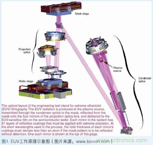 EUV的基本工作原理:激光對準(zhǔn)氙氣噴嘴。當(dāng)激光擊中氙氣時,會使氙氣變熱并產(chǎn)生等離子體;一旦產(chǎn)生等離子體,電子便開始逃逸,從而發(fā)出特定波長的光;接著這種光進(jìn)入聚光器,然后后者將光匯聚并照到掩膜上;通過在反射鏡的一些部分施加而其它部分不施加吸收體,在反射鏡上形成芯片一個平面的圖案的光學(xué)表示,這樣就產(chǎn)生了掩膜;掩膜上的圖案被反射到四到六個曲面反射鏡上,從而將圖像微縮,并將圖像聚投到硅晶圓上;每個反射鏡使光線稍微彎曲以形成晶圓上的圖像,這就像照相機(jī)中的透鏡將光彎曲以在膠片上形成圖像一樣。