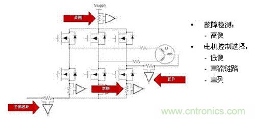 如圖1所示,基本上有三種不同的方法來測量三相電動機驅動系統(tǒng)中的電流:低側、直流鏈路和直列測量。圖1所示的是傳統(tǒng)三相PWM逆變器,該逆變器使用三對功率MOSFET(絕緣柵雙極晶體管IGBT也很常見)來驅動直流電動機。該圖還包括高側電流感應,其通常在顯著錯誤情況下使用,比如接地電路短路的情況。